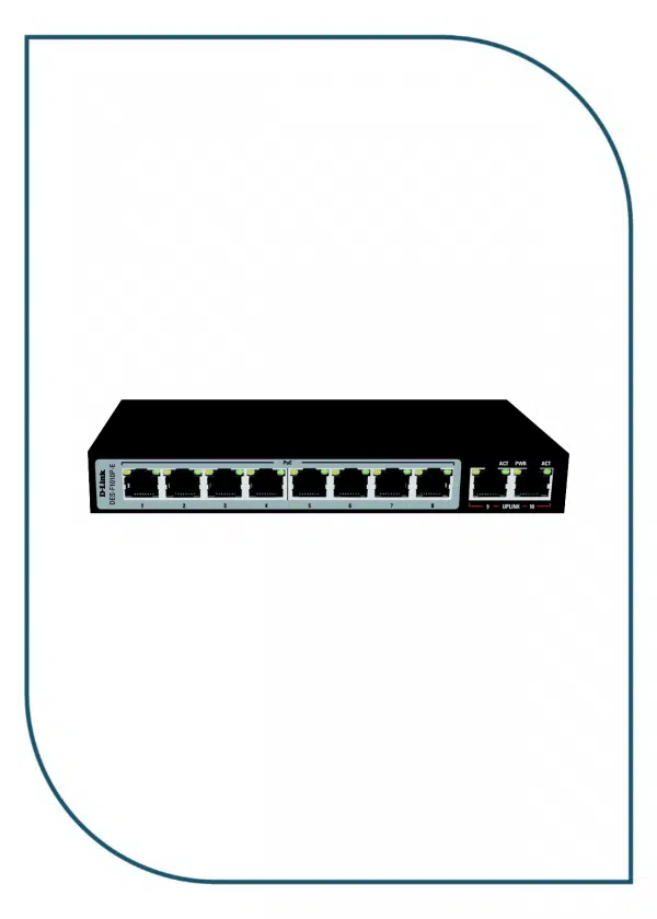 The D-Link DES-F1010P-E is a 10 port 100Mbps with 8 10/100 Mbps PoE ports, 2 10/l00Mbps uplink ports. This Switch enables users to easily connect and supply power to PoE-capable devices such as wireless Access Points (APs), IP cameras.