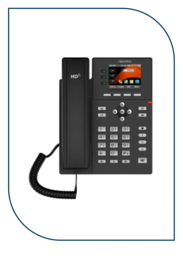 The Fiberme FAP2740G is a high-performance 4-line IP phone with gigabit ports, color display, HD voice, and support for wireless headsets—ideal for growing business environments.