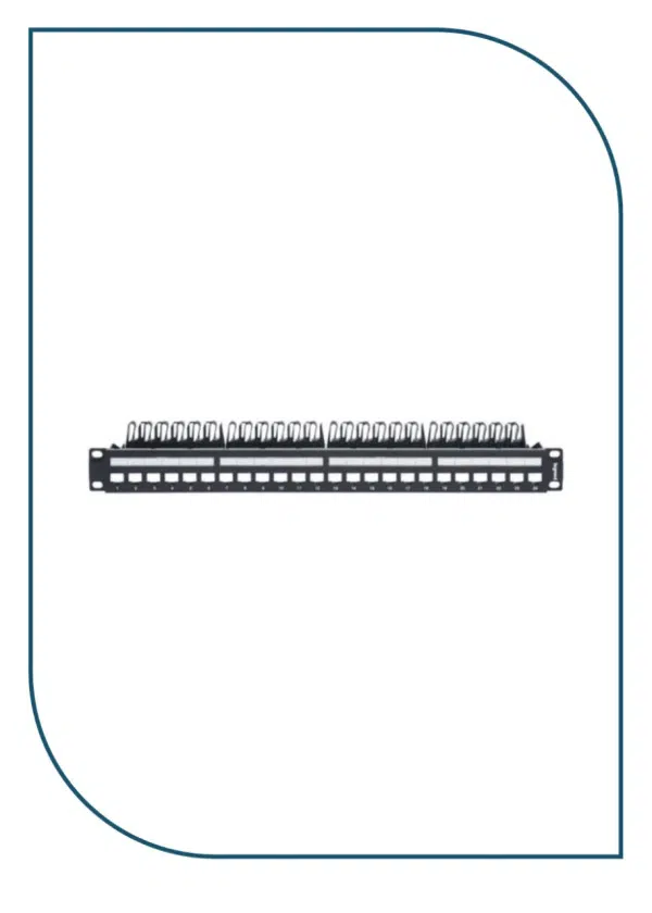 632850 This patch panel has 24 RJ45 connectors (category 5e, 6, or 6A), a rear cable management system, and a metal cable holder. It is designed for 24 keystone category 5e, 6 or 6A