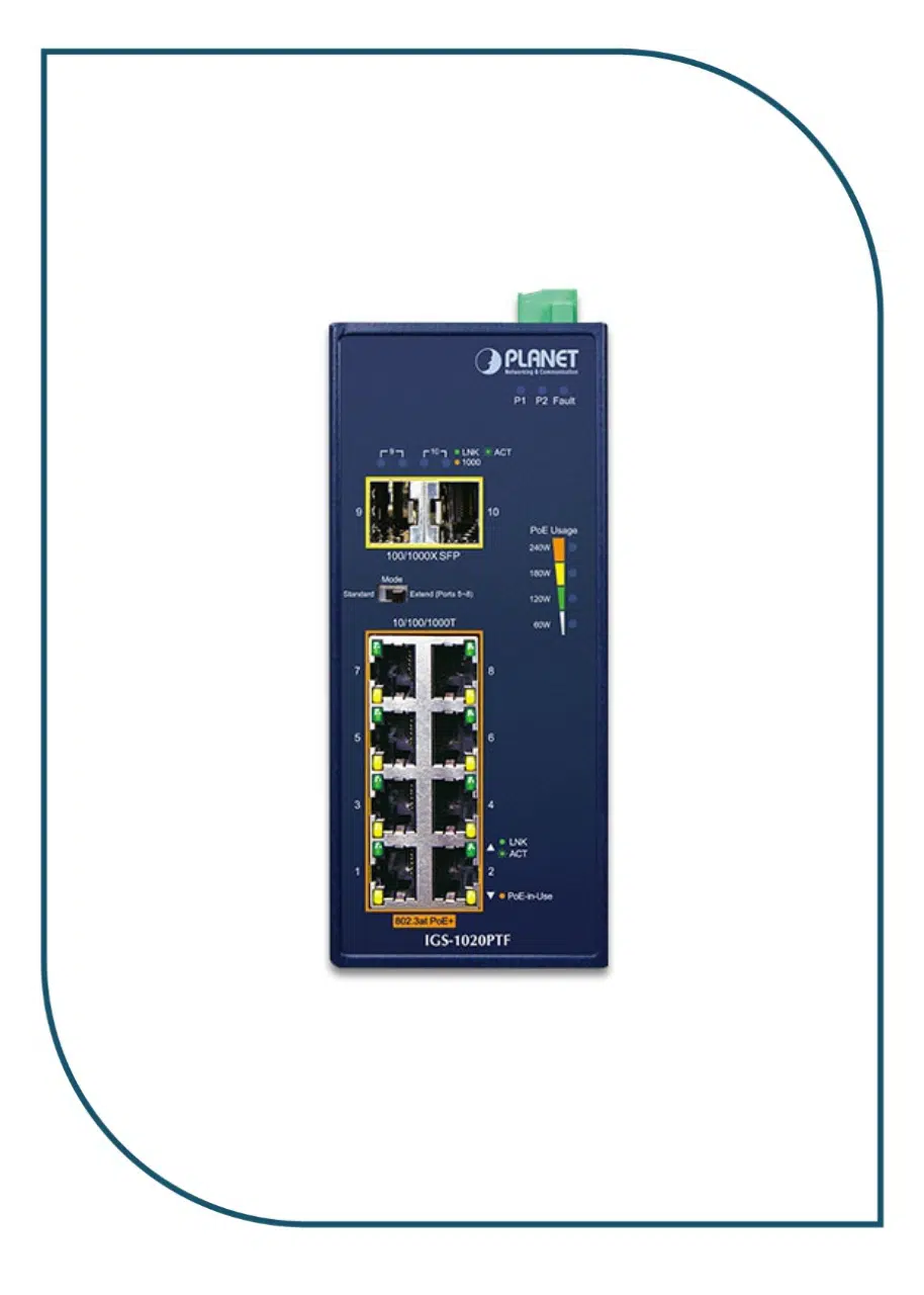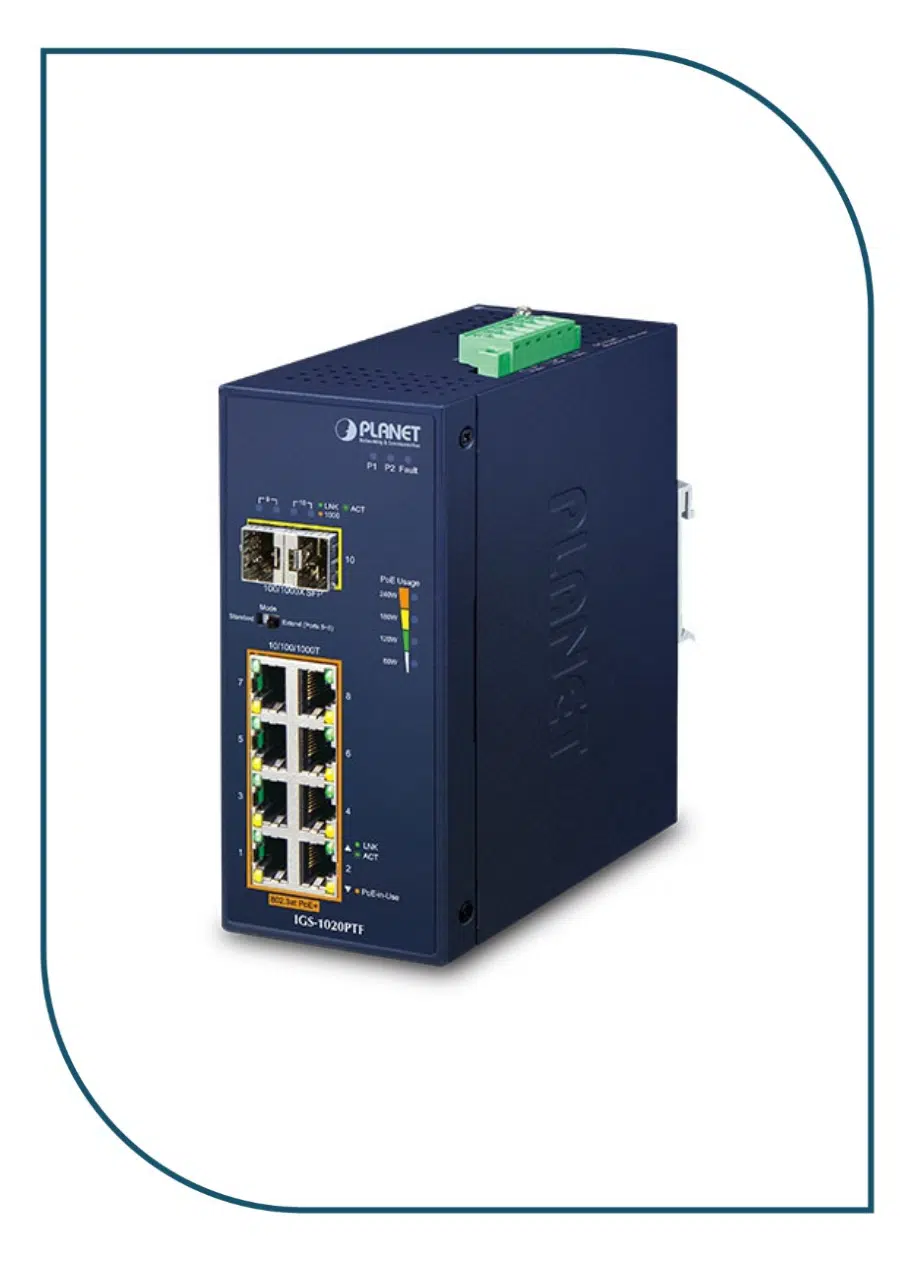 Featuring Plug and Play designed to be installed in heavy industrial demanding environments, PLANET IGS-1020PTF is an Industrial-grade, DIN-rail type Unmanaged Gigabit Ethernet PoE+ Switch with eight 10/100/1000BASE-T ports featuring IEEE 802.3at PoE+ and two 100/1000BASE-X fiber optic interfaces for uplink connection.