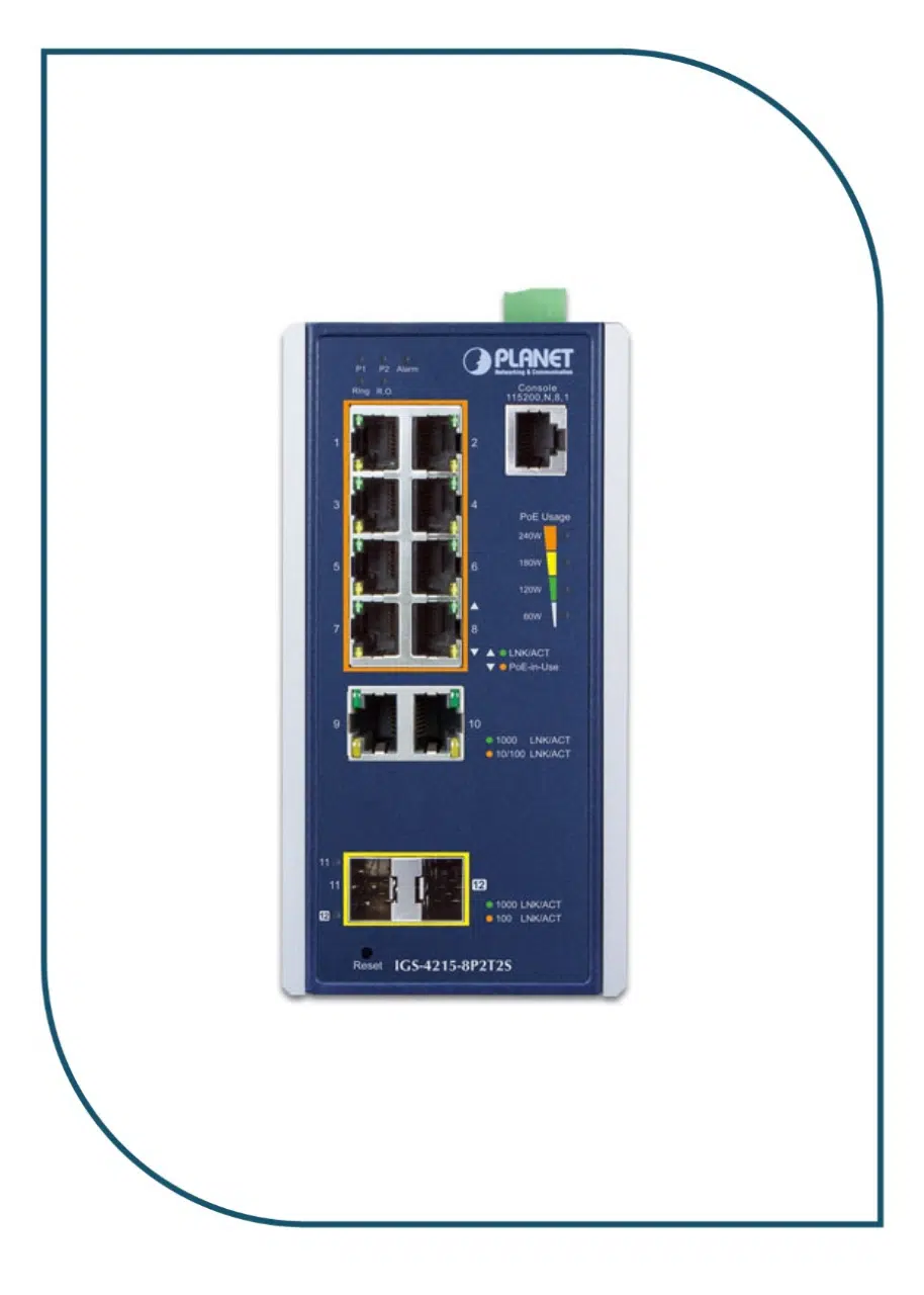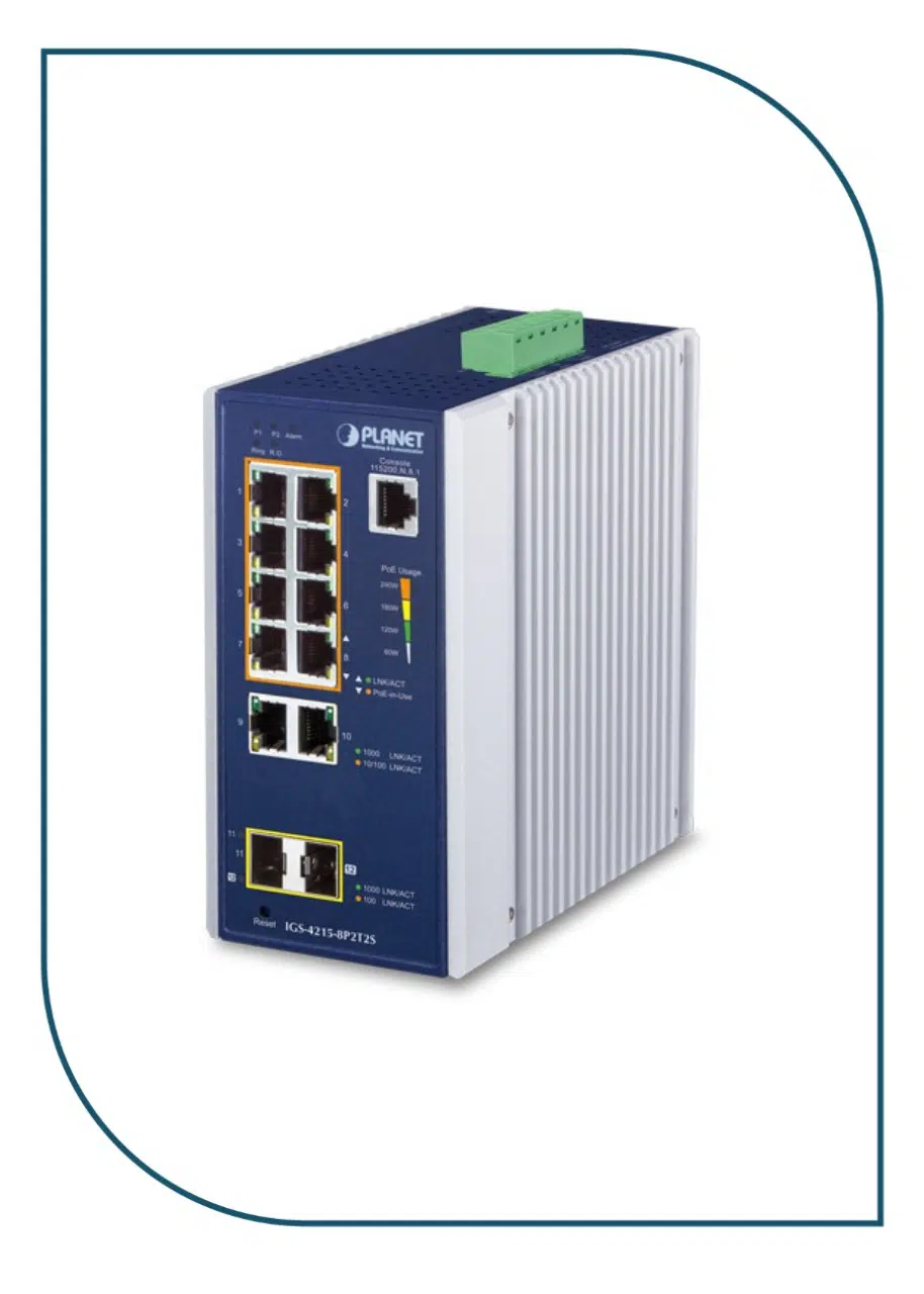 PLANET’s IGS-4215-8P2T2S Industrial-grade, DIN-rail type L2/L4 Managed Gigabit PoE+ Switch features PLANET’s intelligent PoE functions to improve the availability of critical business applications in industrial environments. It provides IPv6/IPv4 dual stack management and built-in L2/L4 Gigabit switching engine along with 8 10/100/1000BASE-T ports featuring 30-watts of 802.3at PoE+, 2 additional Gigabit copper ports and another 2 extra 100/1000BASE-X SFP fiber slots for data and video uplink. The IGS-4215-8P2T2S is able to operate reliably, stably and quietly in any industrial environment without affecting its performance. It comes with a total power budget of up to 240 watts for different kinds of PoE applications an IP30 metal housing that allows it to operate at a temperature range from -40 to 75°C.