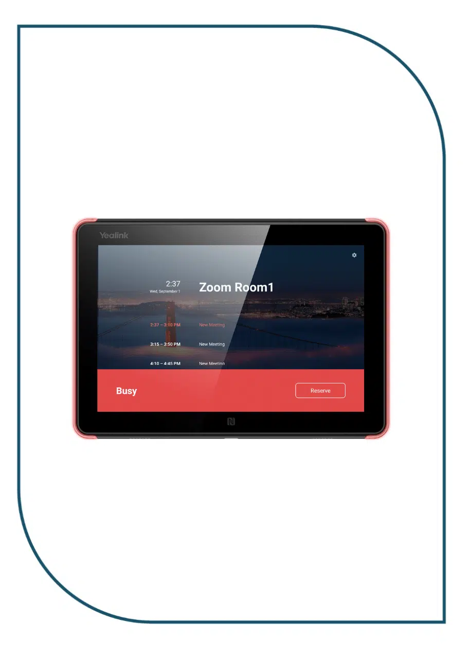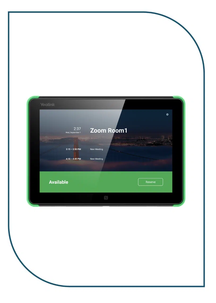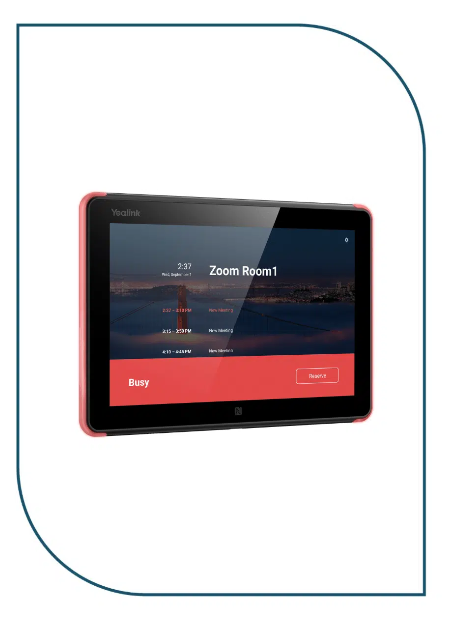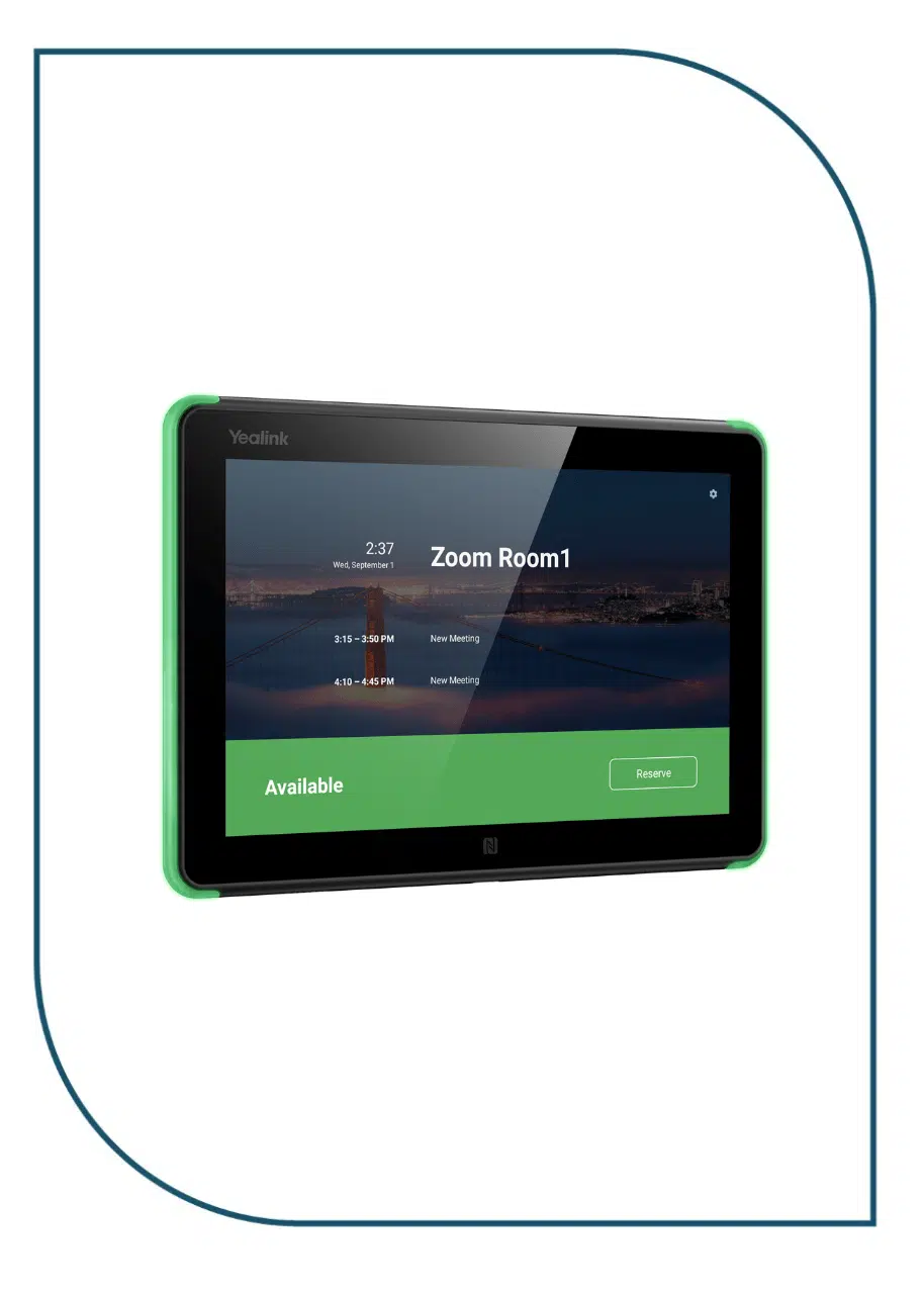 Yealink RoomPanel is an 8-inch all-in-one meeting room schedule panel that runs Android 10.0 and comes with full RGB programmable LED background illumination for immediately visible communication of room status. It includes 10-point touch capability, 802.11ac Wi-Fi, Bluetooth 5.0, a built-in NFC/RFID reader, enhanced microphone arrays and speakers to meet all modern workspace demands.